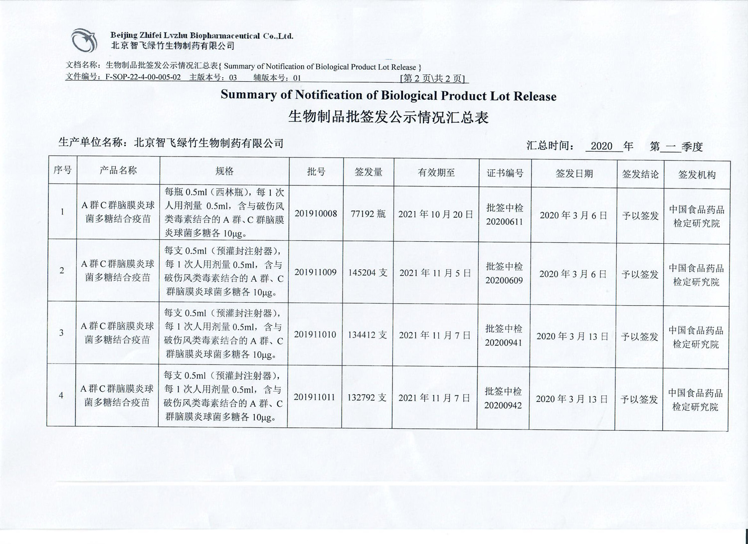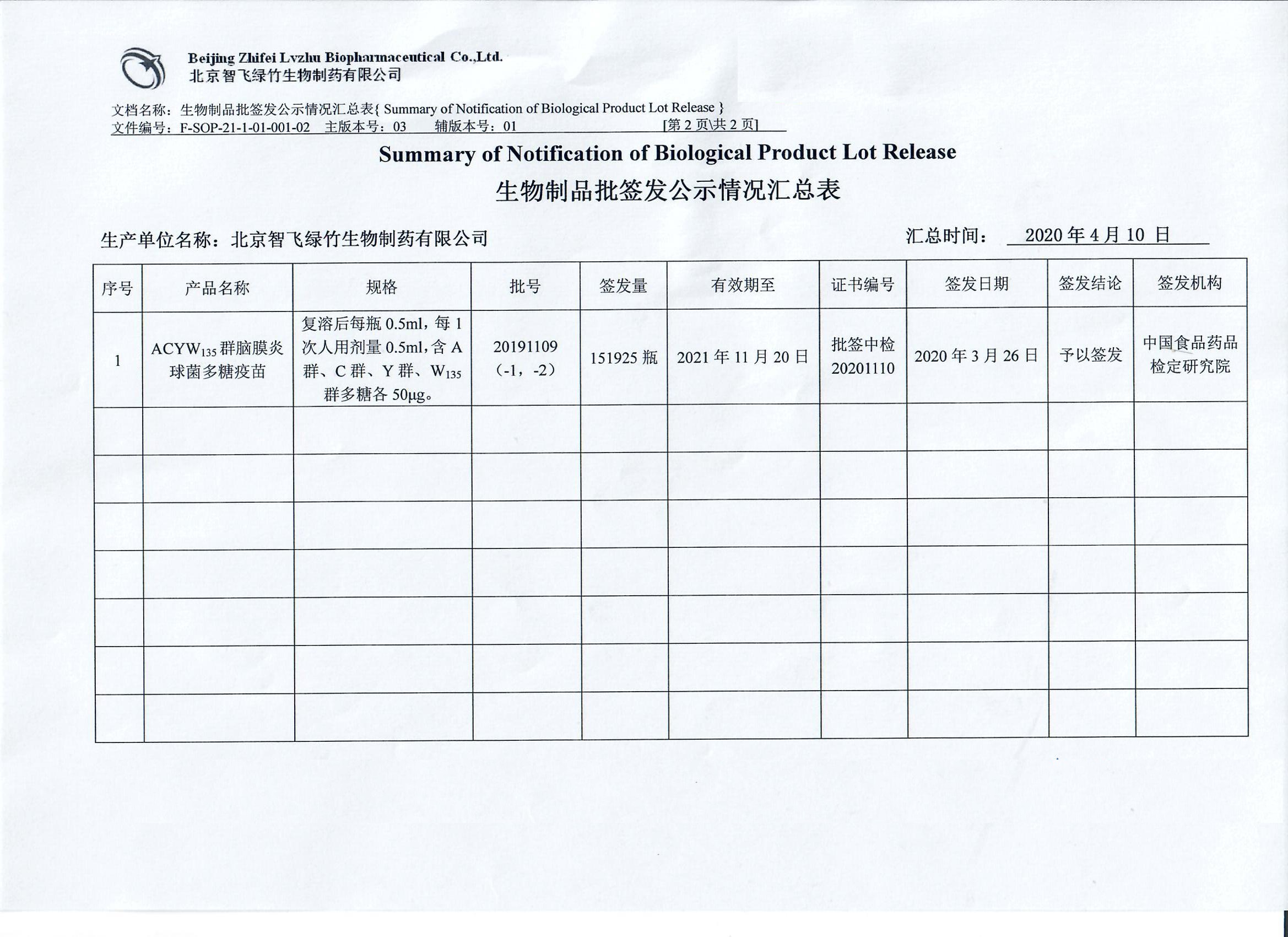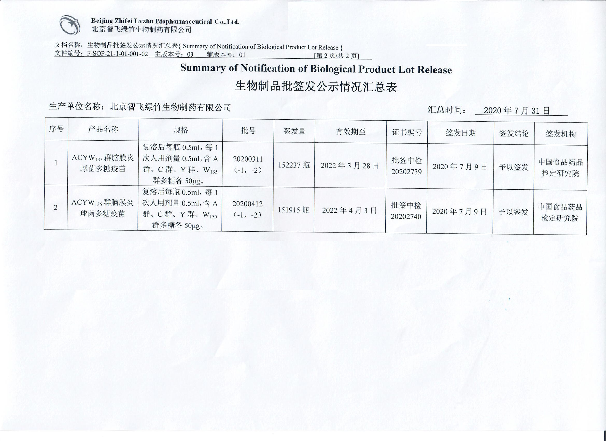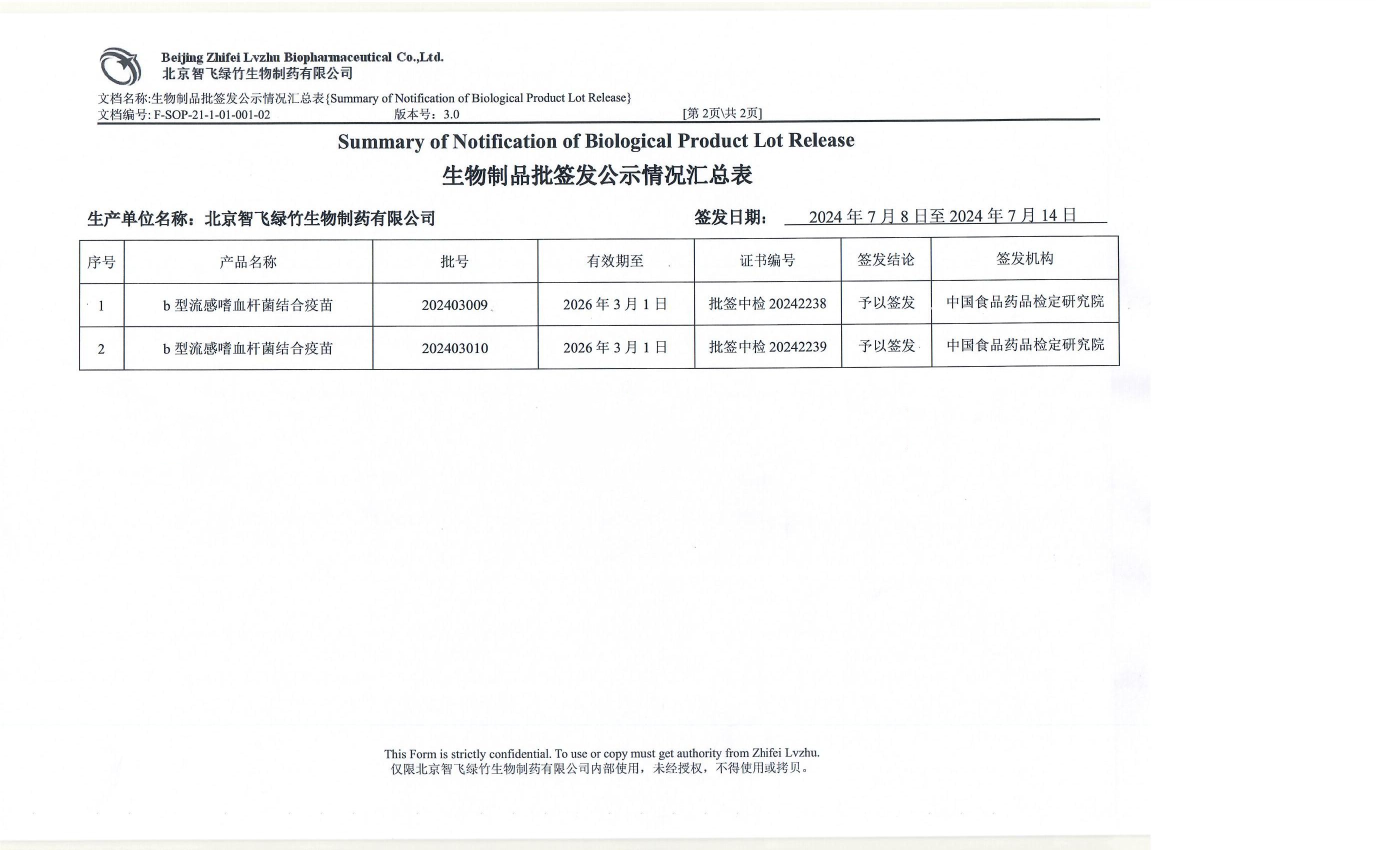 北京智飛綠竹生物制藥有限公司批簽發(fā)情況信息公示如下:
